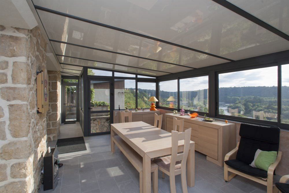 Une véranda avec une toiture monopente